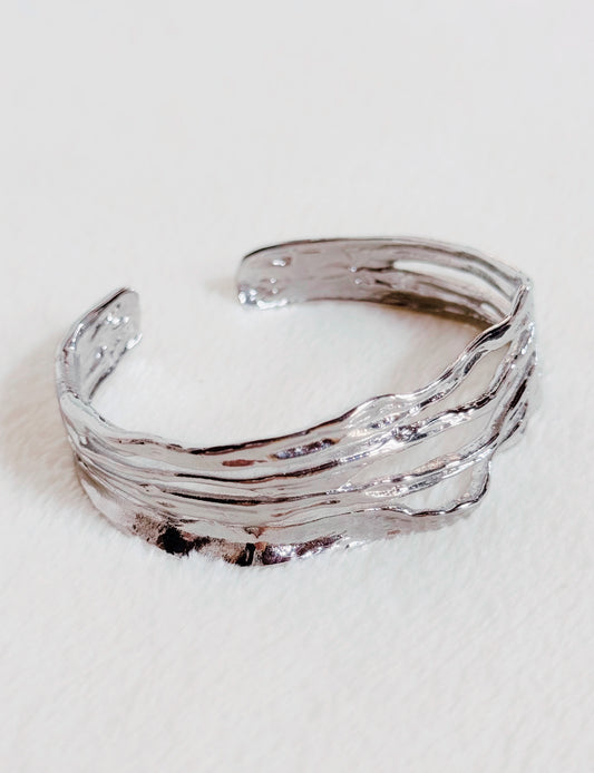 Accesorio tipo pulsera. Diseño asimétrico, plateado.