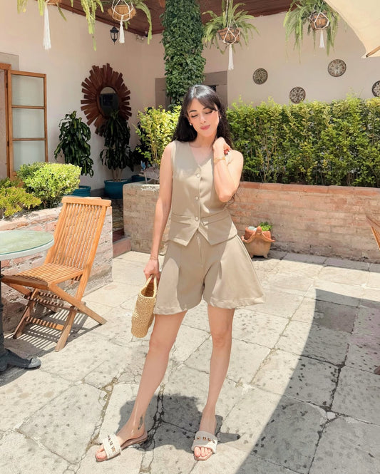 Hermoso conjunto de Short y Chalequito, en tonalidad Beige.
