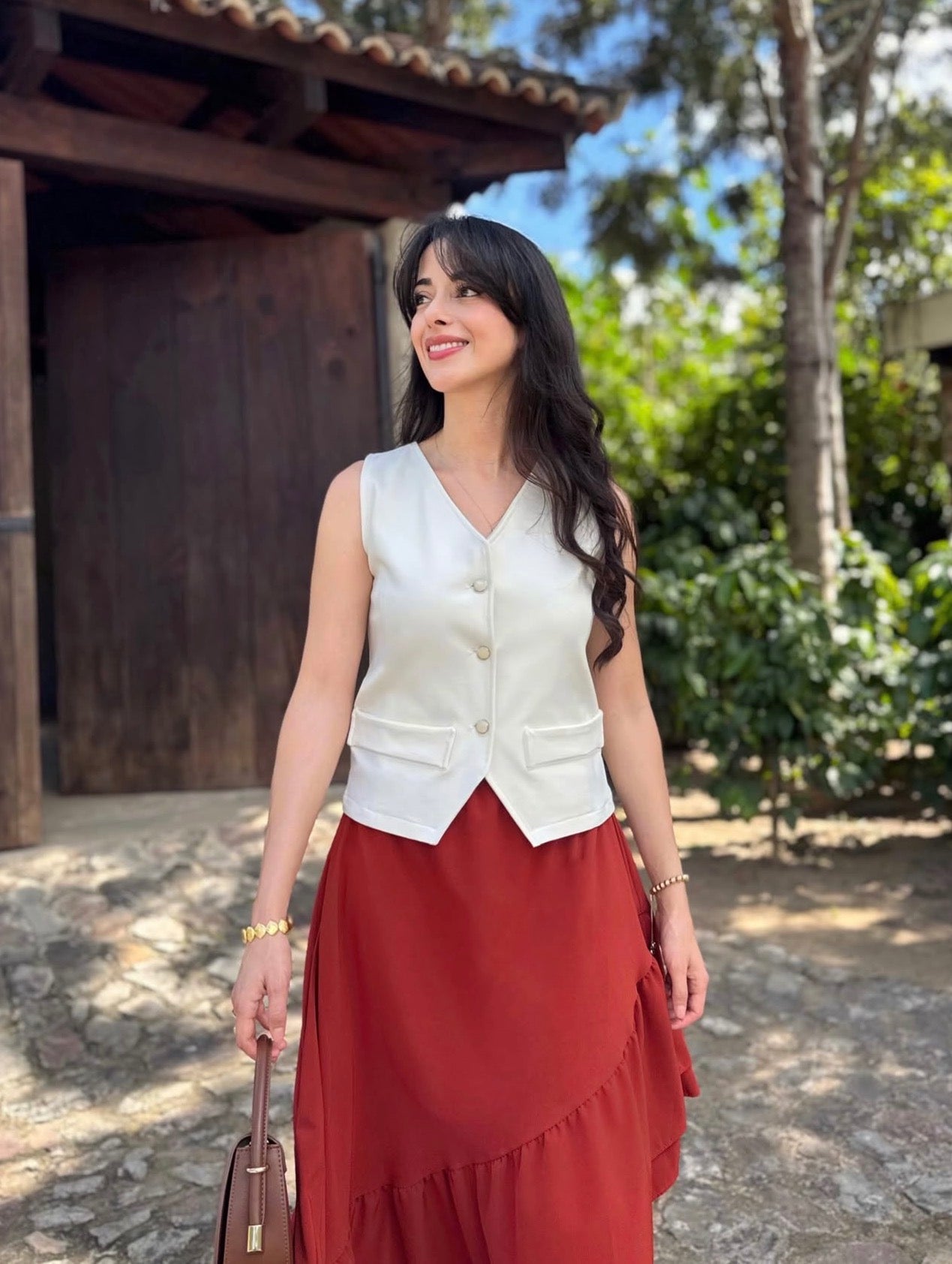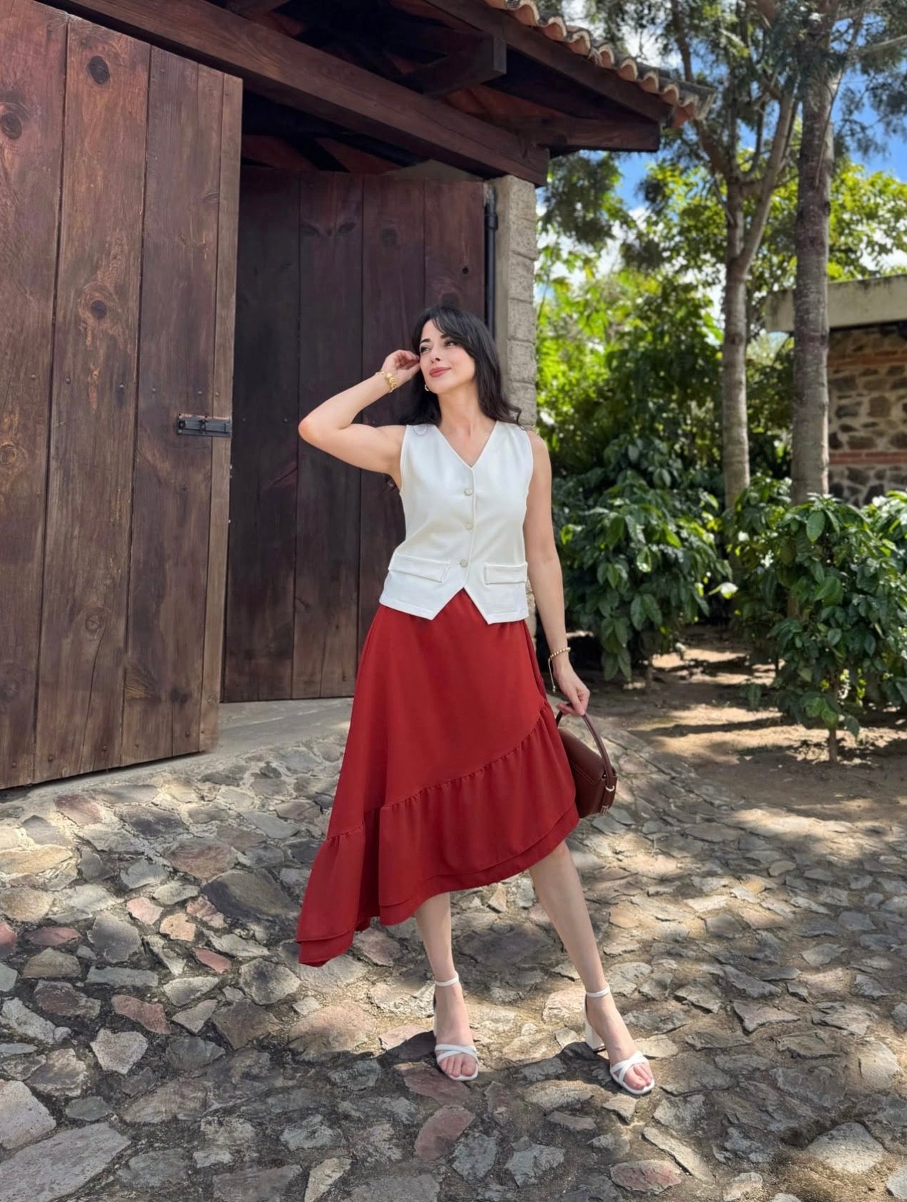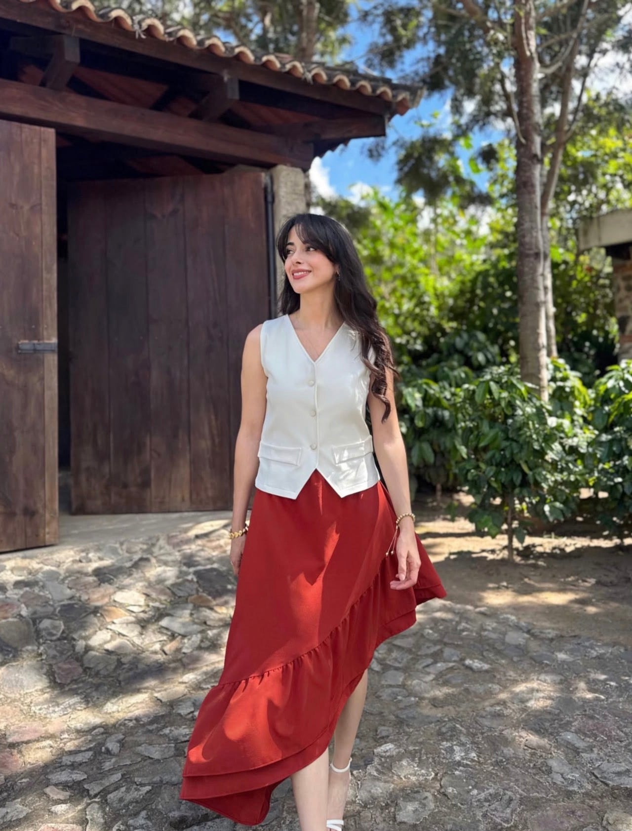La falda se despliega con un movimiento lleno de vida, teñida en un rojo ladrillo profundo que parece inspirado en la tierra cálida, en los muros antiguos iluminados por el sol y en la elegancia natural de los tonos rústicos. Es un color que abraza lo orgánico y lo sofisticado al mismo tiempo, evocando fuerza, calidez y un encanto terrenal irresistible.